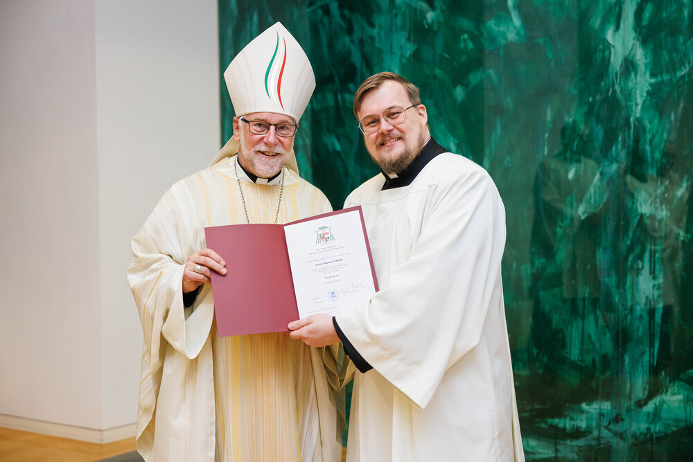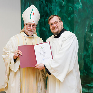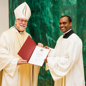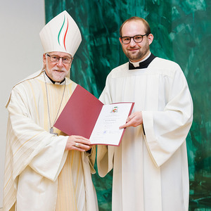 Ajayan Joseph, für die Diözese Punalur (Indien), und Lukas Krobath aus der Pfarre St-Theresia, empfingen die Beauftragung zum Akolythen. Neben der Assistenz in der Messe sind Akolythen zum Dienst des Aussetzens des Allerheiligsten für die eucharistische Anbetung und das Bringen der Kommunion zu den Kranken und Alten bestellt. Bischof Marketz betonte, dass es wichtig ist diesen Dienst mit der Gemeinde zu verrichten und dass wir durch unsere Tätigkeit weitere Gläubige dazu ermutigen und befähigen sollten, sich in den Akolythendienst stellen zu lassen. Denn die Eucharistie ist, wie es das 2. Vatikanische Konzil formuliert: „Quelle und Höhepunkt des christlichen Lebens“ (Lumen Gentium 11).