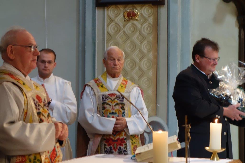 Der Vorsitzende des neuen Pfarrgemeinderates, sein "Täufling" Franz Rappold, und der Vorsitzende des Kirchenrates Adriach, Ludwig Fassl, gratulierten ihm hernach im Namen der Pfarrgemeinde zum Jubiläum und wünschten ihm Gottes Segen für sein weiteres Priesterleben und sein Wirken!