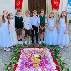 Danke auch allen Eltern für den wun­der­schö­nen Blu­men­tep­pich vor der Kir­che und die Be­glei­tung der Kin­der zu die­sem Hoch­fest.