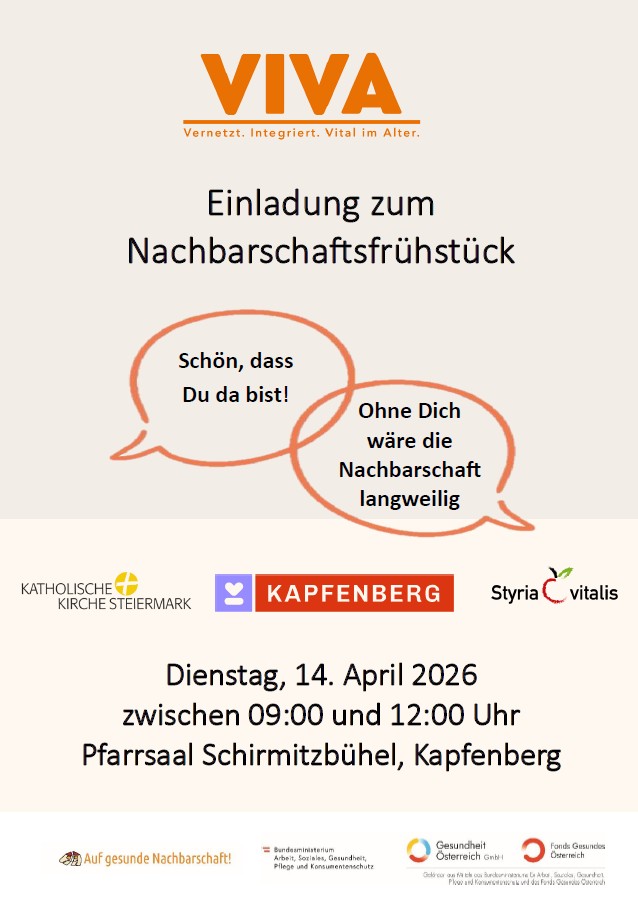 Das Projekt "VIVA - Vernetzt.Integriert. Vital im Alter." lädt zu einem Nachbarschaftsfrühstück am Dienstag, den 14. April, von 9:00 bis 12:00 Uhr in den Pfarrsaal Schirmitzbühel ein.